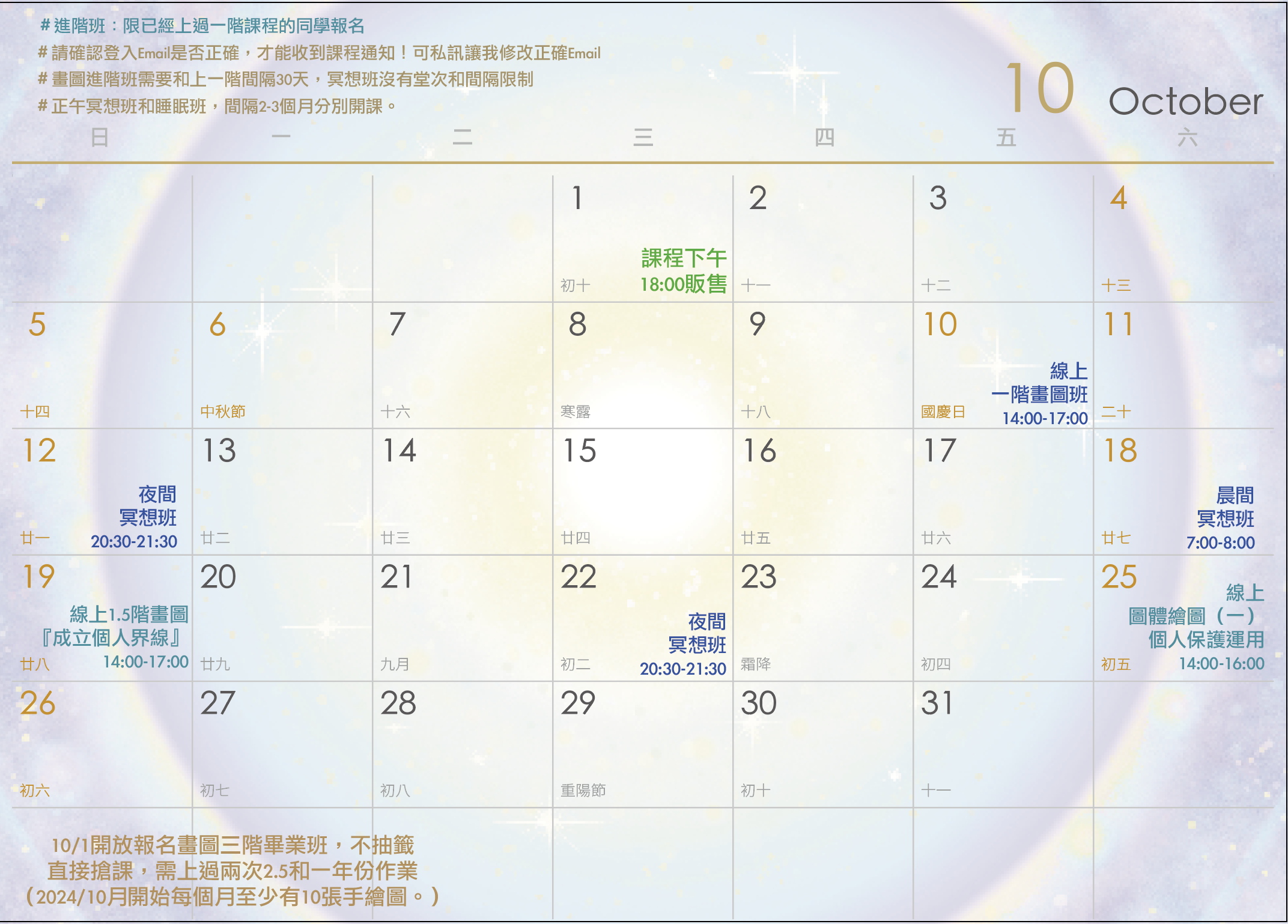 🍎 10月之後每個月開辦新的進階班團體課:「團體班(一)|個人保護運用」,這算是更進階班,建議同學至少畫圖超過100張作品(不必給我看,是要讓你們知道自己的畫風),再來上此堂課。一樣可以重複上課,至少上過一階。這堂課會很累!超累!長老已經準備操爆你們,所以只有兩小時喔!到時候月底會放上課程介紹給你們參考。如果對自己的畫風不熟(未滿百張),通常也是靈魂對自己的能量還不熟,那你上這堂課應該壓力會超大,還不知道自己在畫啥鬼,總之評估好自己的狀況,別浪費錢嘿。團體班(一)開幾堂之後,我再來考慮團體班(二)的主題。總之我會評估同學的整體狀態決定課程方向。
